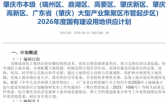 肇庆本级2026年供地计划出炉! 其包括端州区、鼎湖区、高要区、肇庆新区、肇庆高新